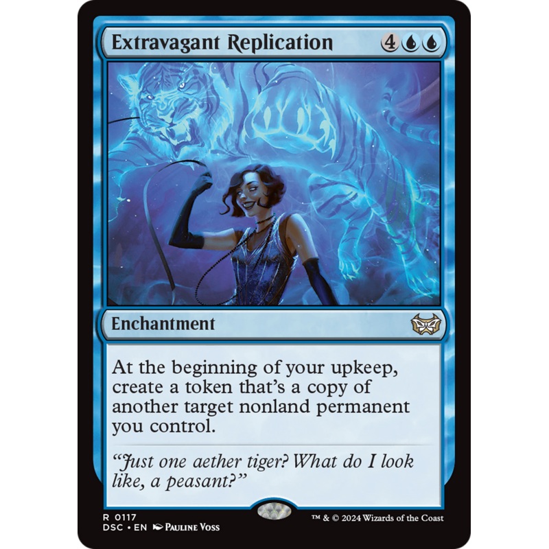 Set: Duskmourn: House of Horror Commander Type: Enchantment Rarity: Rare Cost: {4}{U}{U} At the beginning of your upkeep, create a token that's a copy of another target nonland permanent you control. Just one aether tiger? What do I look like, a peasant?