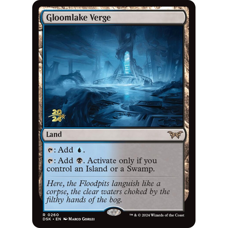 Set: Duskmourn: House of Horror Prerelease Promos Type: Land Rarity: Rare {T}:Add {U}. {T}: Add {B}. Activate only if you control an Island or a Swamp. Here, the Floodpits languish like a corpse, the clear waters choked by the filthy hands of the bog.